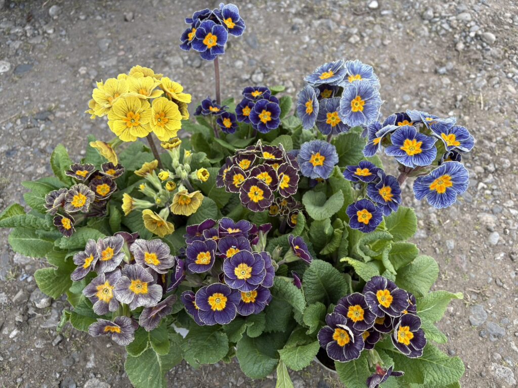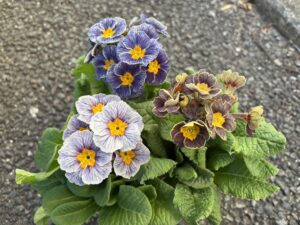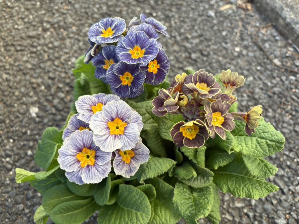 本日の植物はプリムラ、品種名はアンティークマリアージュといいます。宮崎県の川越路可さんが作出し、群馬県の松原園芸で生産販売されたもので、野生種のプリムラ・ベリスを思わせる花茎が伸びた先に、複雑な色の花が咲きます。イギリスの品種には、このような色の品種があり、それらを元に品種改良されたものが数品種流通しますが、アンティークマリアージュが唯一の花茎がしっかり伸びる品種になります。