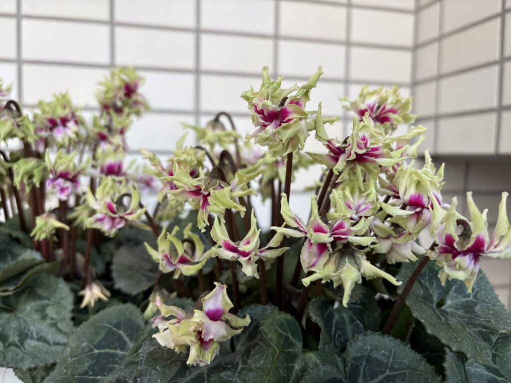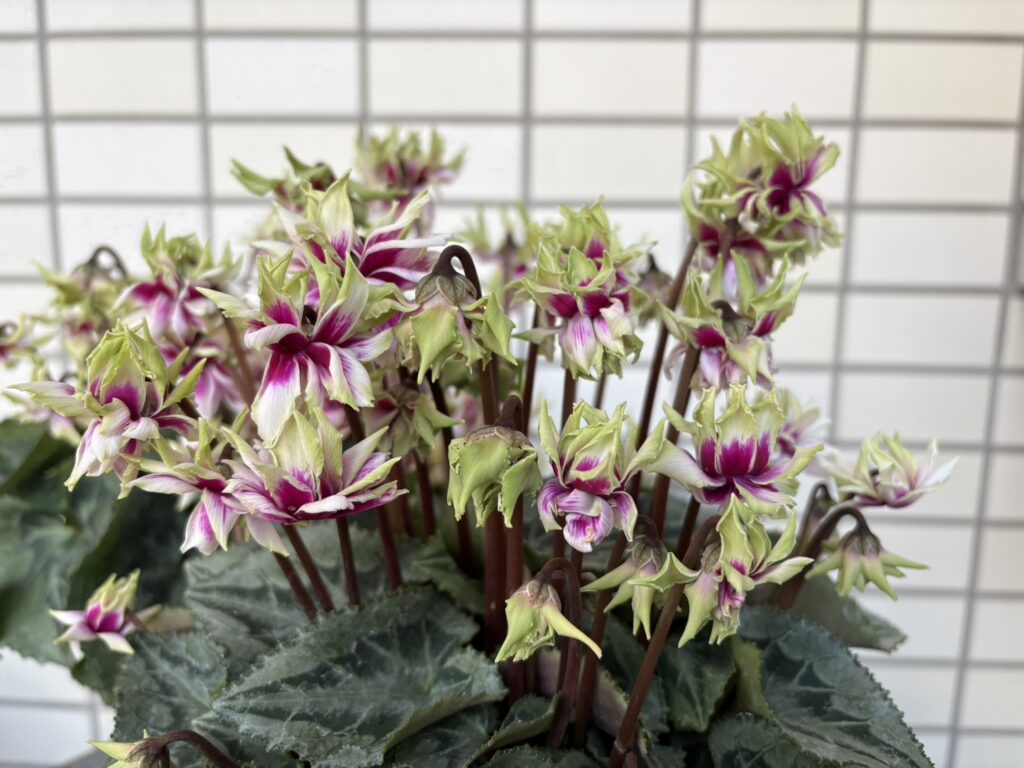 本日の植物はシクラメン。神奈川県の「はら園芸」作出の新しい品種で、試作品種につき品種名はありません。今年度はわずかな数量しか出荷していません。八重咲きの花弁は細く、先端が緑色になるとても変わった花で、これまでのシクラメンとは表情が大きく異なります。また、切り花でも楽しめ、室温の低い場所では1つの花が1ヶ月ほど咲いており、鉢でも切り花でも長く楽しめる品種です。