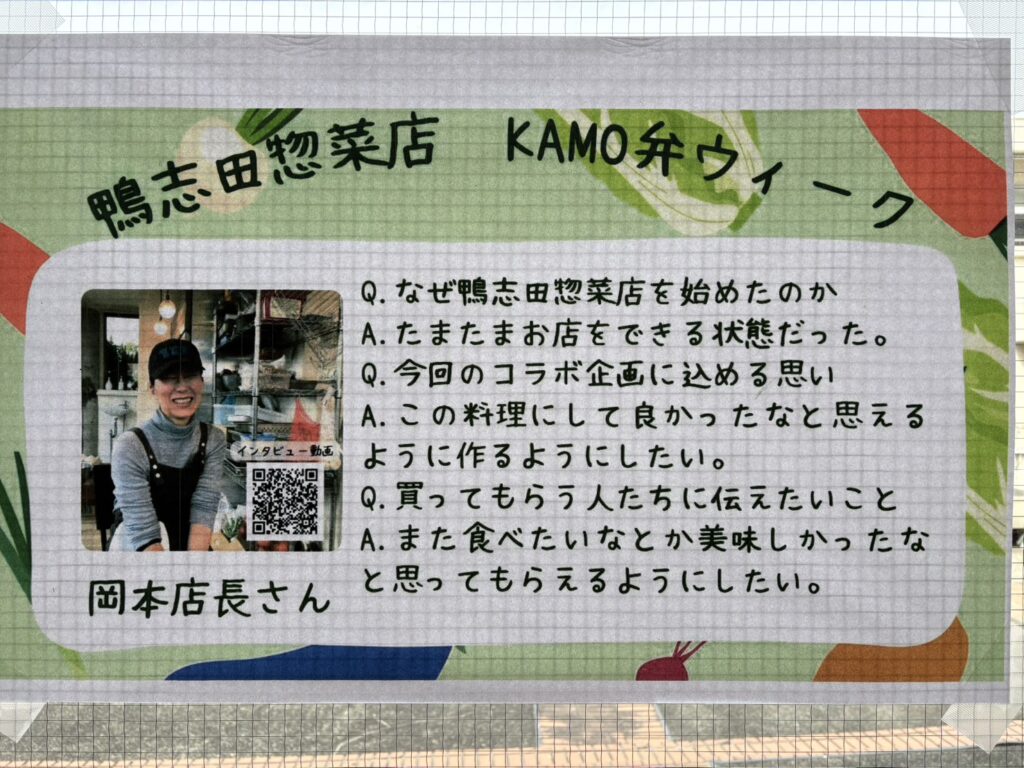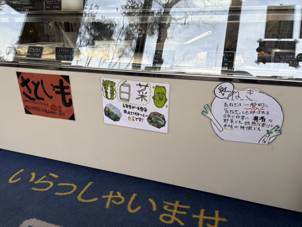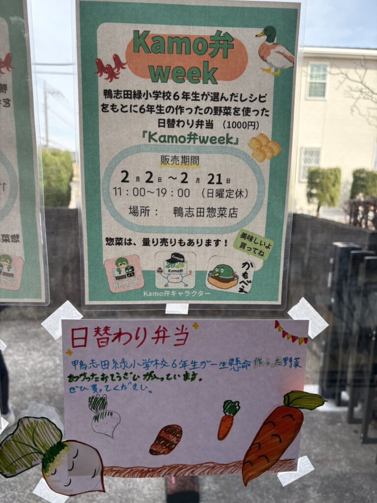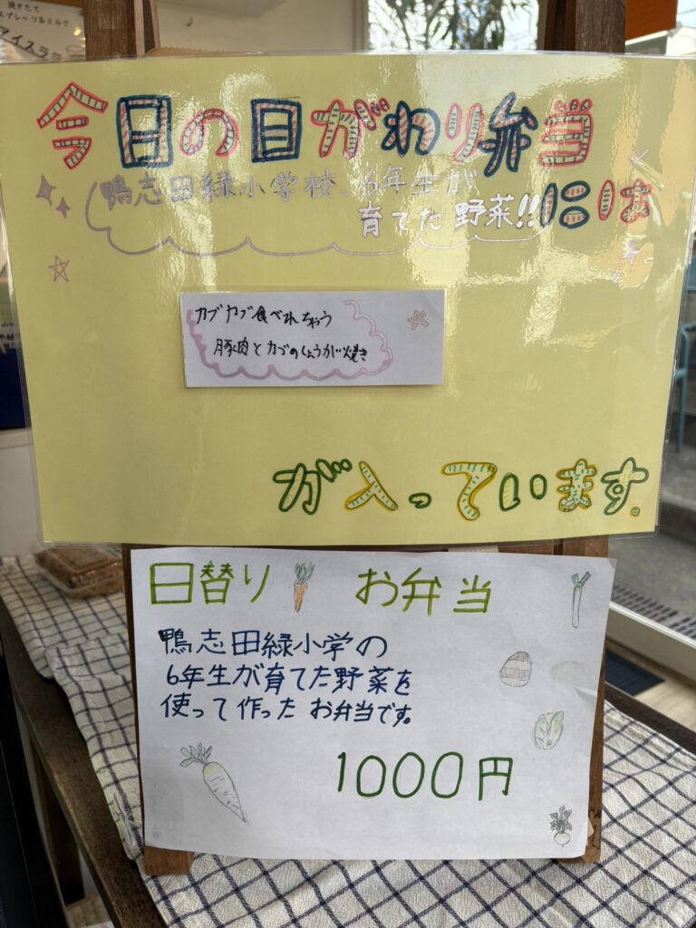 自分たちで育てた野菜のおいしさを地域の方に知ってもらうため、地元の惣菜店に協力してもらい、児童が考えたメニューを惣菜店で調理しています。完成した惣菜は日替わり弁当として販売しています。