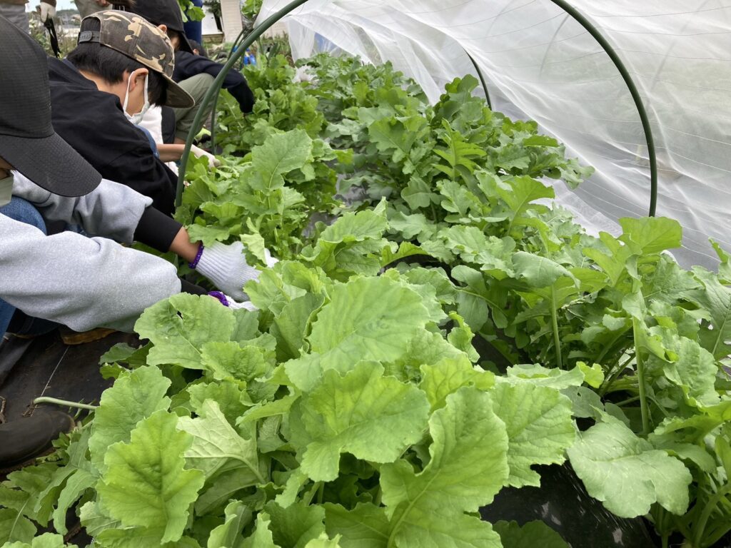 ニンジン、ダイコン、ハクサイ、サトイモ、長ネギなどを、児童たちと共に播種から定植、間引き、土寄せまで行い、農業全般の基礎を指導します。草抜きや畑を耕す準備作業は、ボランティアと協力して、作付け計画に合わせて実施します。