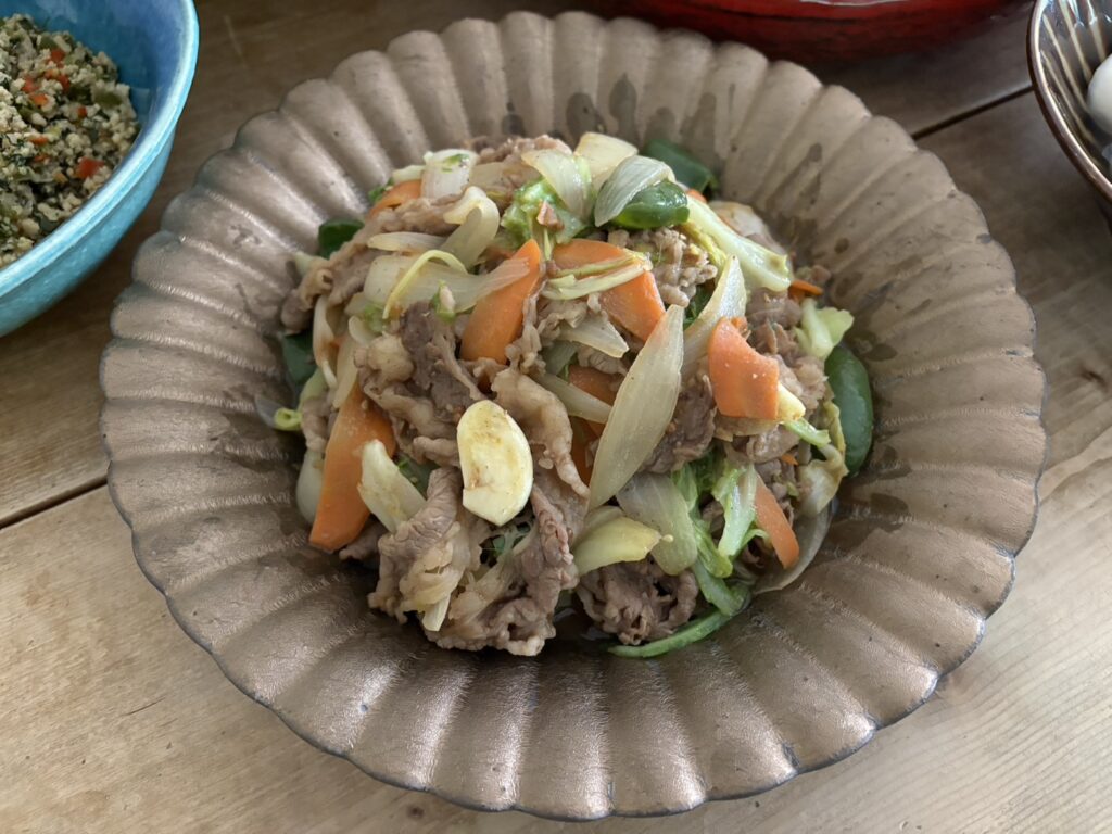 ●キャベツ タマネギ ニンジン ピーマン牛肉の辛味噌炒め