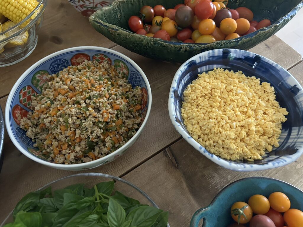 ●ピーマンとニンジンの鶏そぼろと炒り卵 丼にして
